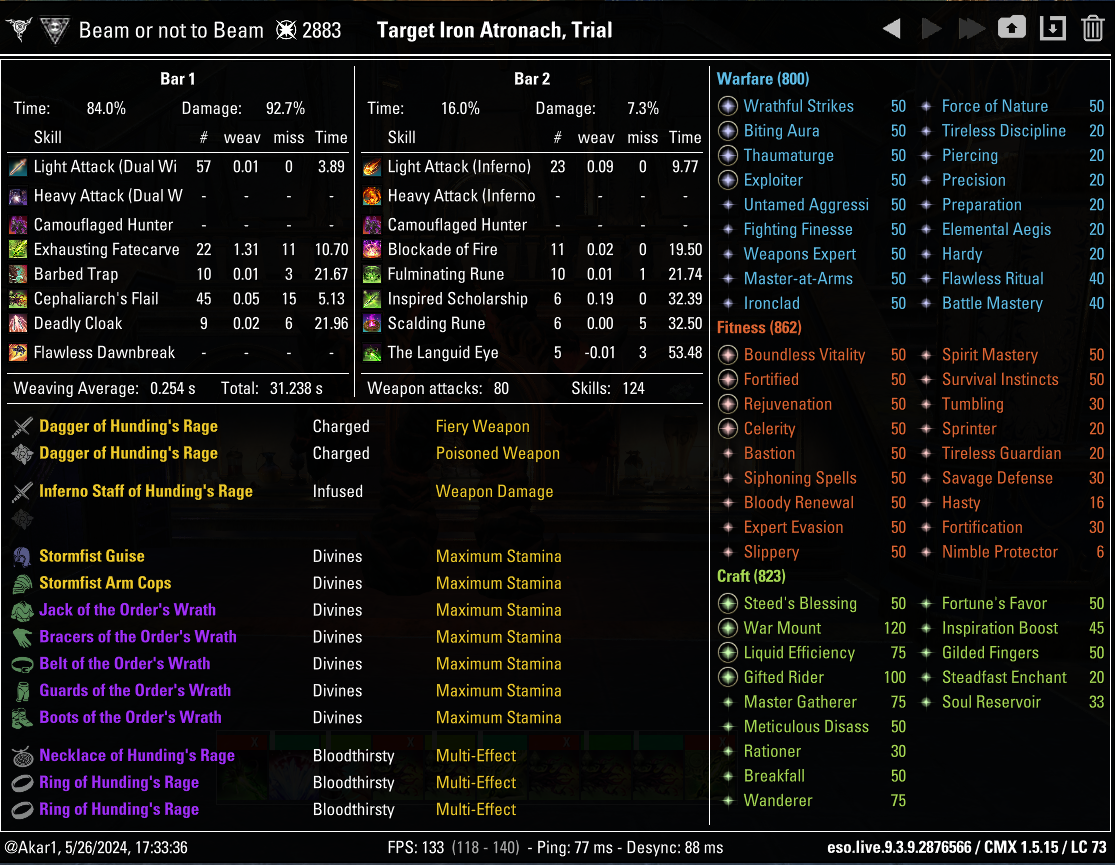 Кастуємо Deadly Cloak та Inspired Scolarship подалі від цілі, кидаємо Scalding Rune, підходимо, кидаємо капкан (Barbed Trap), кастуємо Elemental Blockade, запускаємо ульту Languid Eye, двічі кастуємо Cephaliarch's Flail і далі бім Exhausting Fatecarver, після цього Fulminating Rune, двічі Cephaliarch's Flail і знову бім Exhausting Fatecarver. Далі починаємо ротацію.