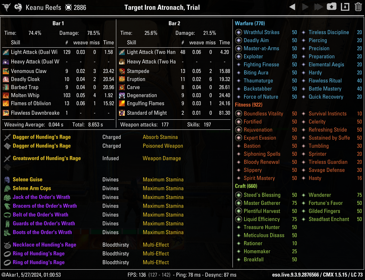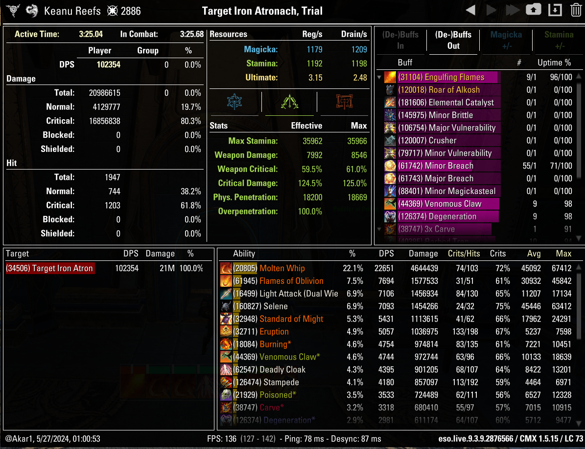 Важливе доповнення: у ДК є прихований баф на 300 сили зброї та заклинань при 3-х стаках коли на панелі стоїть скіл Molten Whip. Стаки набиваються на 15 секунд, коли ви кастуєте скіли із гілки Ardent Flame (всі, окрім хлисту - Engulfing Flames, Flames of Oblivion, Venomous Claw). Зазвичай цей баф тримається сам по собі, але інколи стаки можуть спадати. Тому для максимального дамагу можна або поставити аддон Cooldowns, який виведе таймер цього бафу, або на 3-4 секунди раніше перекастовувати Venomous Claw.