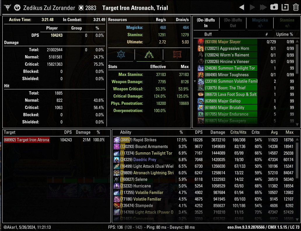 Прикликаємо та кастуємо обох звірів - Volatile Familiar та Twilight Tormentor, Hurricane, активуємо ульту Power Overload і Stampede до цілі. Кидаємо Barbed Trap, Daedric Prey. Далі до ~200 очків ульти проводимо ротацію і коли очки ульти падають до 200 - протискаємо ульту Summon Charged Attronach. Після цього активуємо тільки її.